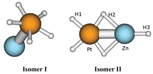 Информацию, полученную с помощью метода фотоэлектронной спектроскопии, обработал физик-теоретик Анастасия Александрова (Anastassia Alexandrova) из Университета Калифорнии, которая смогла расшифровать структуру, в которой атом цинка связан с атомом платины, который, в свою очередь, окружен пятью атомами водорода. Этот цикл H5 стабилизирован за счет σ-ароматичности, возникшей не без помощи атома платины. В итоге можно сказать, что структура кластера напоминает гриб с ножкой из металлов и шляпкой из водородного цикла.